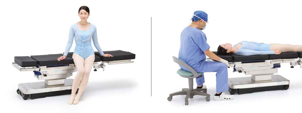Our operating table has a low height of 520mm*, even with the cassette tunnel built in. This is effective for microsurgery, laparoscopic surgery and neurosurgical operations, which are performed by seated surgeon. In addition, patients can safely mount themselves onto the operating table before surgery.