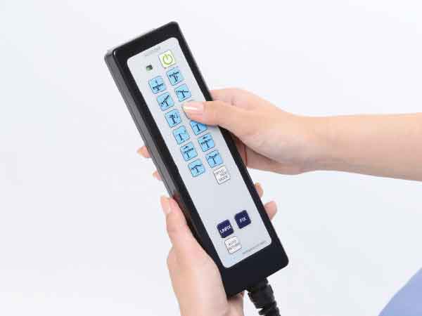 The double-action system includes a handheld controller that can be safely operated. Press the power button, then select an operation button. The power button automatically deactivates after 10 seconds to prevent accidental pressing by medical personnel. If the handheld controller stops working, the built-in main controller can be used instead.Positioning