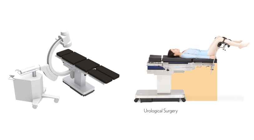The table top can be extended 200mm from the head end and 300mm from the foot end. The head, base and foot section can be swapped easily, enabling a wider range of imaging and supporting all kinds of fluoroscopic surgery. The C-arm can easily be used in urological surgery simply by flipping the head plate and the foot plate. Slide the operating table to the foot side in order to carry this out. During an operation procedure, doctors might be required to insert a catheter. A thorough X-ray of the patient’s urethra may be conducted, and the C-arm feature addresses this flawlessly as it allows X-rays to be captured easily.Easy X-ray Imaging