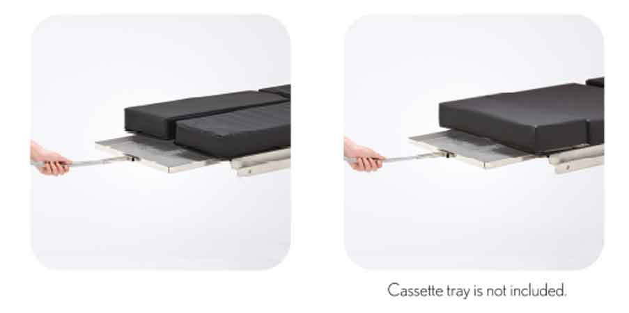 A cassette tunnel for the tray is a standard feature. The cassette can be inserted from the head end or the foot end. The insertion position can be selected to match the imaged area or the patient’s pose, to avoid impeding efficient work. The bottom surface is a Bakelite panel, which has a higher transmission rate than acrylic panels, allowing clearer imaging.
