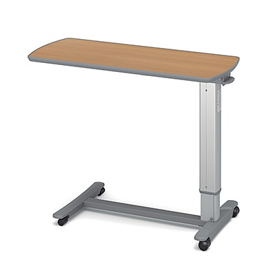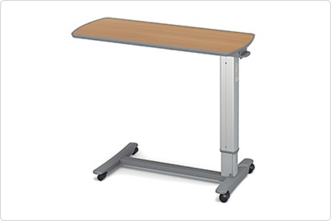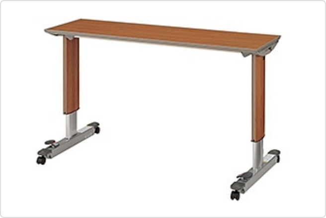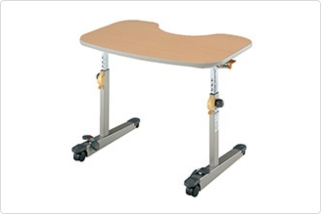 端座位のとれる方は、活動的な前傾姿勢のとれるリハビリテーブルを、端座位のとれない方は、ベッドの上で背上げをした姿勢で使用できるオーバーベッドテー ブル、ベッドサイドテーブルをお選びください。特に壁際にベッドを設置している場合には、ベッドサイドテーブルが便利です。また、サイドレールにのせて使用するテーブルもご用意しています。用途やベッド周辺の環境に合わせてお選びください。