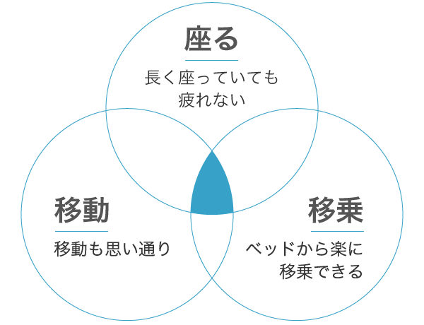 パラマウントベッドでは、ベッドから出て生活することを重視しています。そのため、移乗先となる車椅子には快適に座れることだけでなく、「きちんとした姿勢で座れる」「簡単に安全に移乗できる」「快適に移動できる」という3 つの条件をバランスよく満たす製品をご用意しています。