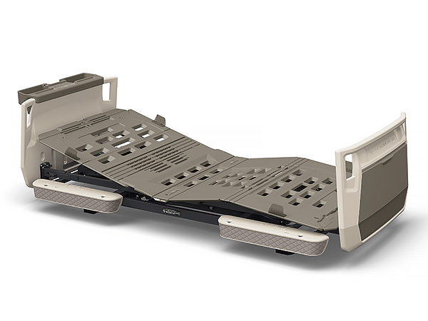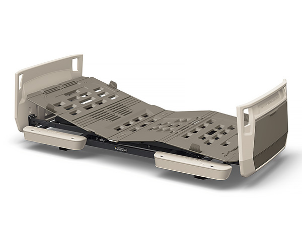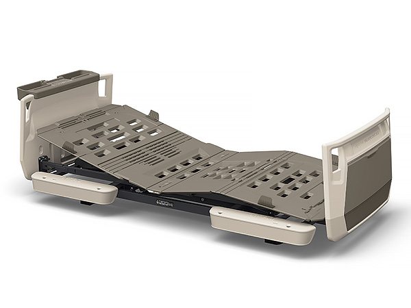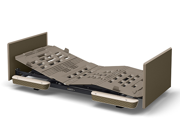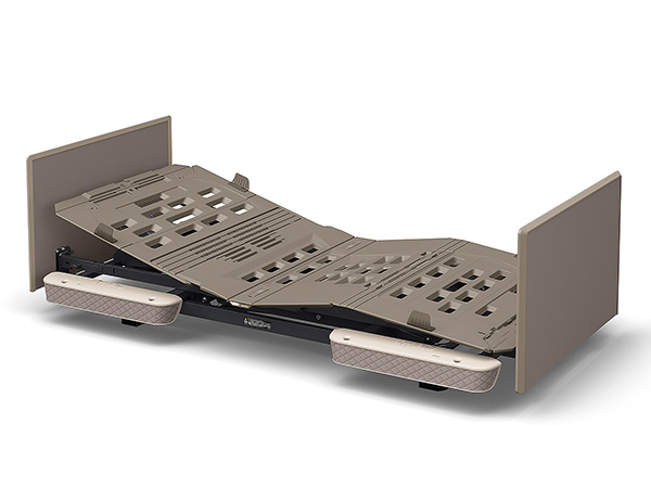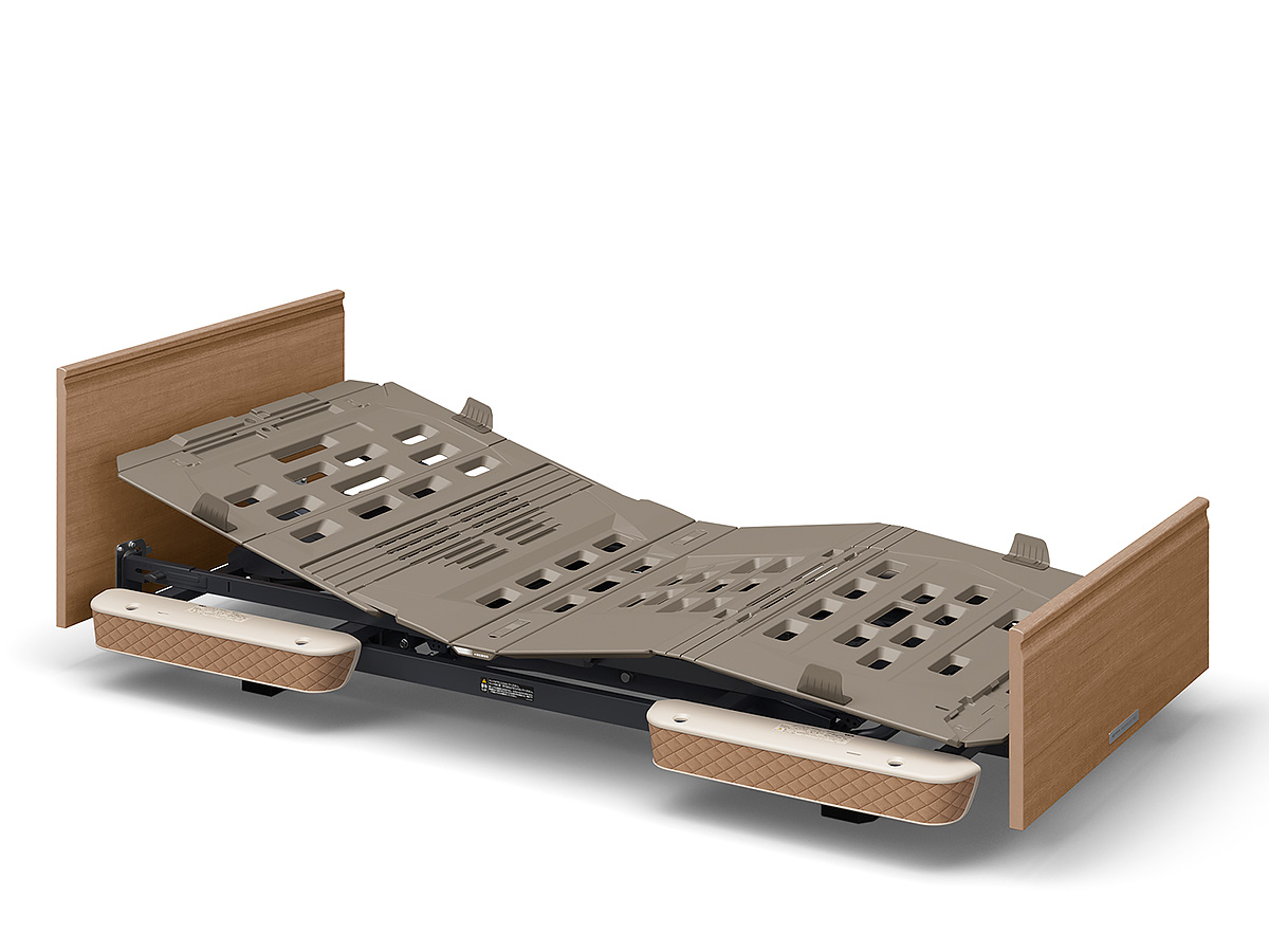 伝い歩きなどに便利なグリップを設けています。グリップはベッドの内側からもつかまれる形状にしてあり、ご本人様が寝位置を調整するときにも利用できます。収納カバーは前機種よりも幅を17cm、高さを8cm拡大、標準サイズ(M)のスライディングボードが治ります。また、収納カバーの下部は収納物の有無がわかる半透明の材質を使用しています。
