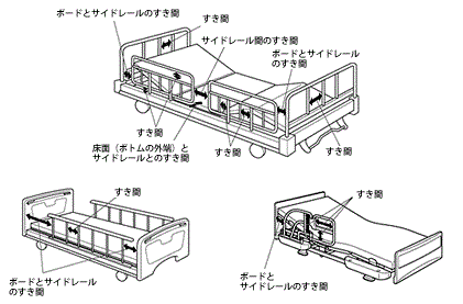 ・ベッド上で予測できない行動をとると思われる方や、自力で危険な状態から回避することができないと思われる方につきましては、これらのすき間に身体の一部(特に頭や首)がはさまれないよう十分ご注意ください。
