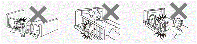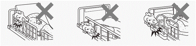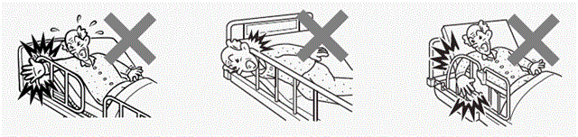 ・身体の一部(特に頭や首)がベッドサイドレールや介助バーにあたり圧迫されると身体の傷害や生命にかかわるけがをするおそれがあります。