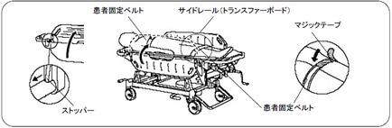 弊社製ストレッチャーは、患者さんの転落予防のために「患者固定ベルト」および「サイドレール(機種によってはトランスファーボード)」を従来から標準仕様としています。患者様をストレッチャーに乗せている間は次の事項をお守りください。