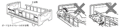 療養される方々の心身の状態や利用環境により、これらのすき間に身体の一部がはさまれたり圧迫される可能性があり、身体の傷害や生命にかかわる事故につながるおそれがありますので、十分ご注意ください。ベッド上で予測でない行動をとると思われる方や、自力で危険な状態から回避することができないと思われる方につきましては、これらのすき間に身体の一部(特に頭や首)がはさまれないように十分ご注意ください。