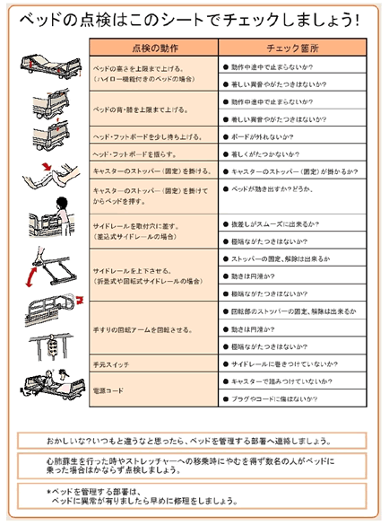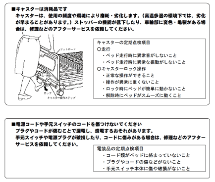 医療・介護ベッド安全普及協議会発行の「ベッドの安全使用マニュアル」(平成15年8月1日発行)には、ベッドの点検について以下のように記載されています。