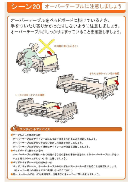 医療・介護ベッド安全普及協議会発行の「ベッドの安全使用マニュアル」(平成15年8月1日発行)には、オーバーテーブルについて以下のように記載されています。