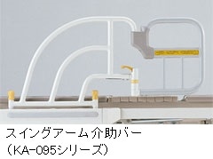 スイングアーム介助バーは、ベッド上での起き上がりから、端座位、立ち上がり、歩き出しに至る一連の動作(もしくは、逆の一連の動作)において、ご利用者の手すりとなる製品です。また、アームを閉じておくことでベッド上からの転落予防用のガードの役割を果たします。これらより介護者の負担も軽減することができます。