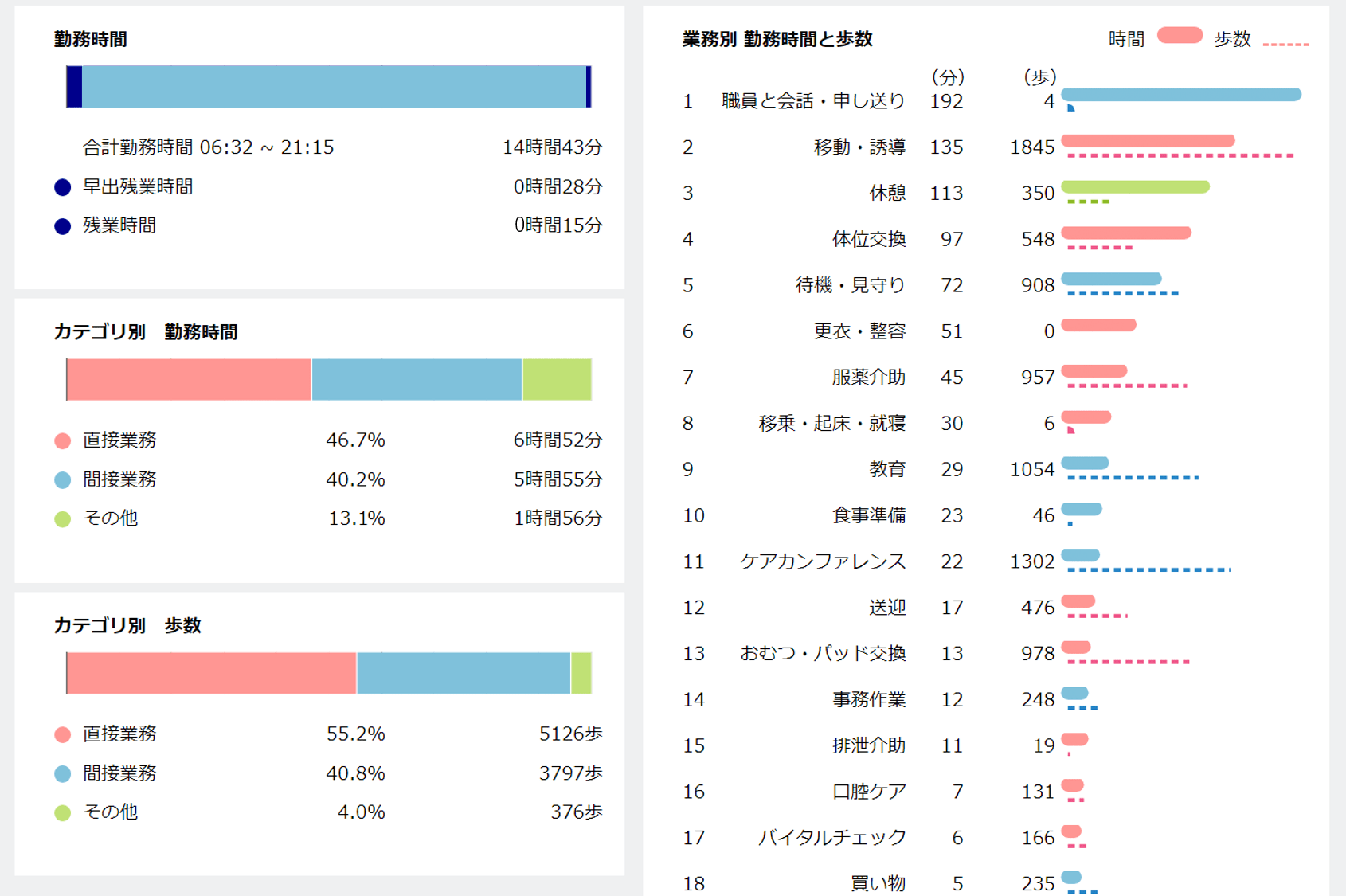 ・業務記録を終えると自動でグラフが生成され、スマートフォンに加えてウェブでも閲覧可能です。フロアごとの集計や従事者間の比較もウェブで簡単に作成できます。