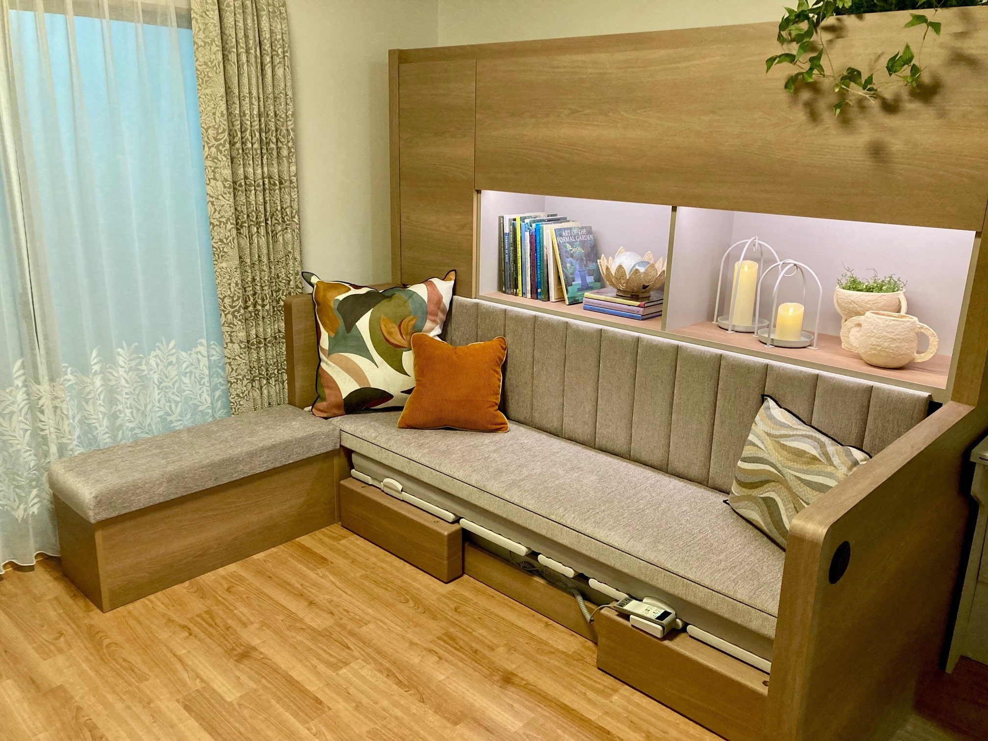 当社がこれまで居室のデザインで培ったノウハウを活かし、日中すぐ横になれるよう置かれた介護用ベッドを収納できるようアレンジしたのがポイントです。ベッドを使わない時にはボタン一つで自動的に収納家具の一部として格納することが可能です。ベッドをソファとしても使用でき、空間を有効活用できます。利用者がラウンジなどの共有スペースに行かなくても、来訪者を部屋に招き、くつろいで会話するシーンをイメージしてデザインしました。過ごし方の多様化にもつながります。