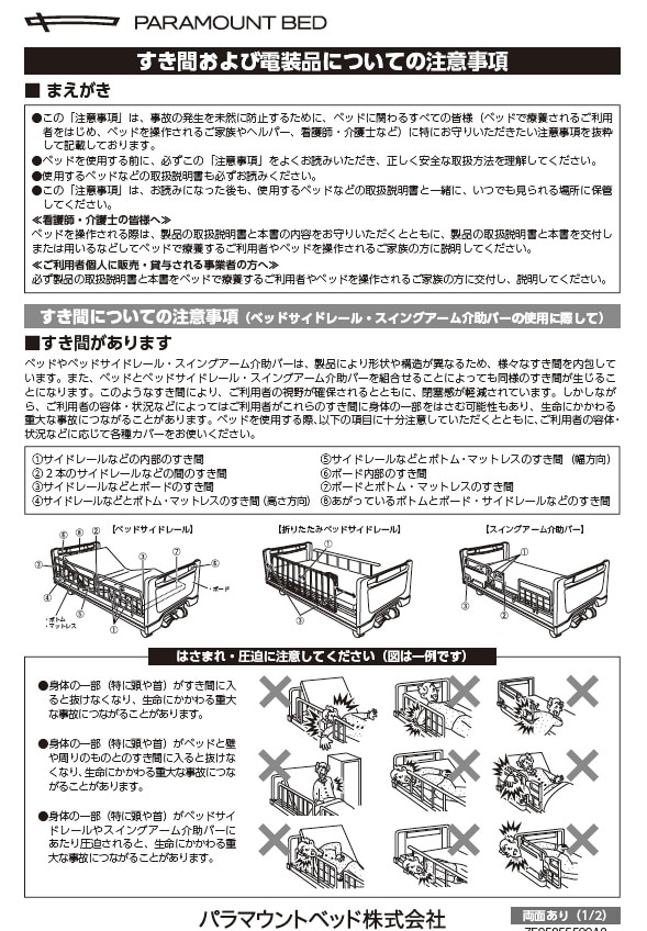 弊社では、医療・介護向けベッドの取扱説明書に同梱しております「すき間および電装品についての注意事項」を改訂いたしました。