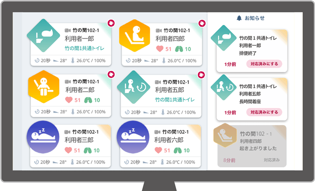 当社は、「睡眠」や「排泄」、「室内の温湿度」等の情報を一元管理できるシステムの提供で、ベッド周りからトイレまで居室全体の見守りにより、介護施設における介護DX推進に貢献してまいります。