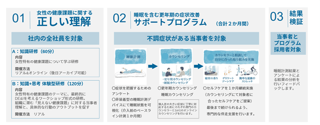 女性従業員の抱える更年期の症状や睡眠などの健康課題に対応するための包括的なサポートプログラムです。