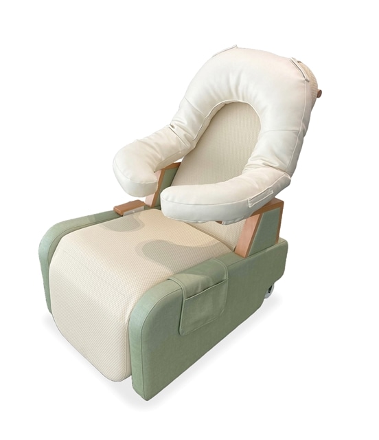 U字型クッションは、赤ちゃんを抱っこする親の両腕と後頭部を支えることで、長時間でも姿勢が崩れにくく、安定した抱っこをサポートします。また、赤ちゃんが装着している医療機器チューブを固定できるベルトを備えており、安全性と利便性を両立しています。さらに、キャスター付きで移動が容易なほか、バックレストやフットレストの角度調整がしやすく、消毒剤で拭ける素材を採用するなど、衛生面にも配慮した設計となっています。これらの工夫が評価され、今回の受賞につながりました。