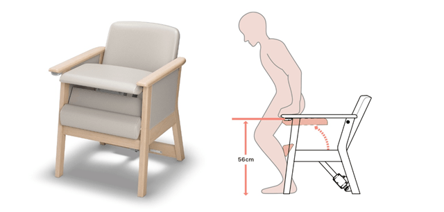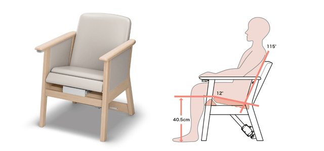 最大の特徴は安楽な姿勢になるように工夫した背もたれと座面です。背もたれは、よりかかりやすいように後方に傾斜(115°)させ、腕が動かしやすいように、肩甲骨の下までの高さに設計しました。座面は後傾(12°)させて、臀部がずれにくく姿勢が安定しやすい構造としました。アームレスト下部にあるスイッチを握ると、座面が40.5㎝から56㎝まで上昇し、自力での立ち座りをサポートします。上昇した時の座面はほぼ水平で、滑り落ちも予防します。やわらかい色味の天然木と淡いグレー色の生地を使用し、通常使う家具に合わせやすいデザインを目指しました。