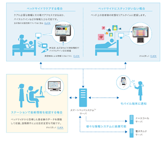 本連携により、看護師がベッドサイドやスタッフステーションに常駐することなく日病モバイル端末で患者のベッド上の動きや生体情報等を確認することができることから情報共有やケアの効率化を実現し、今年4月から「医師の働き方改革」が始まる医療機関の業務効率化を支援してまいります。