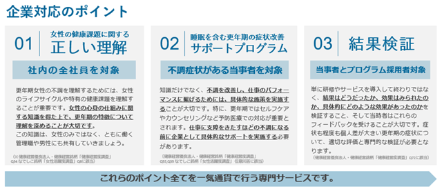 女性社員の働きやすい環境や企業の健康経営を目指すには、「更年期の⼥性の不調の仕組み」を正しく理解し、⼥性のライフサイクル、⼥性特有の健康課題を知る必要があります。この知識は、当事者の女性のみならず、ともに働く管理職をはじめ男⼥が等しく理解することが重要です。