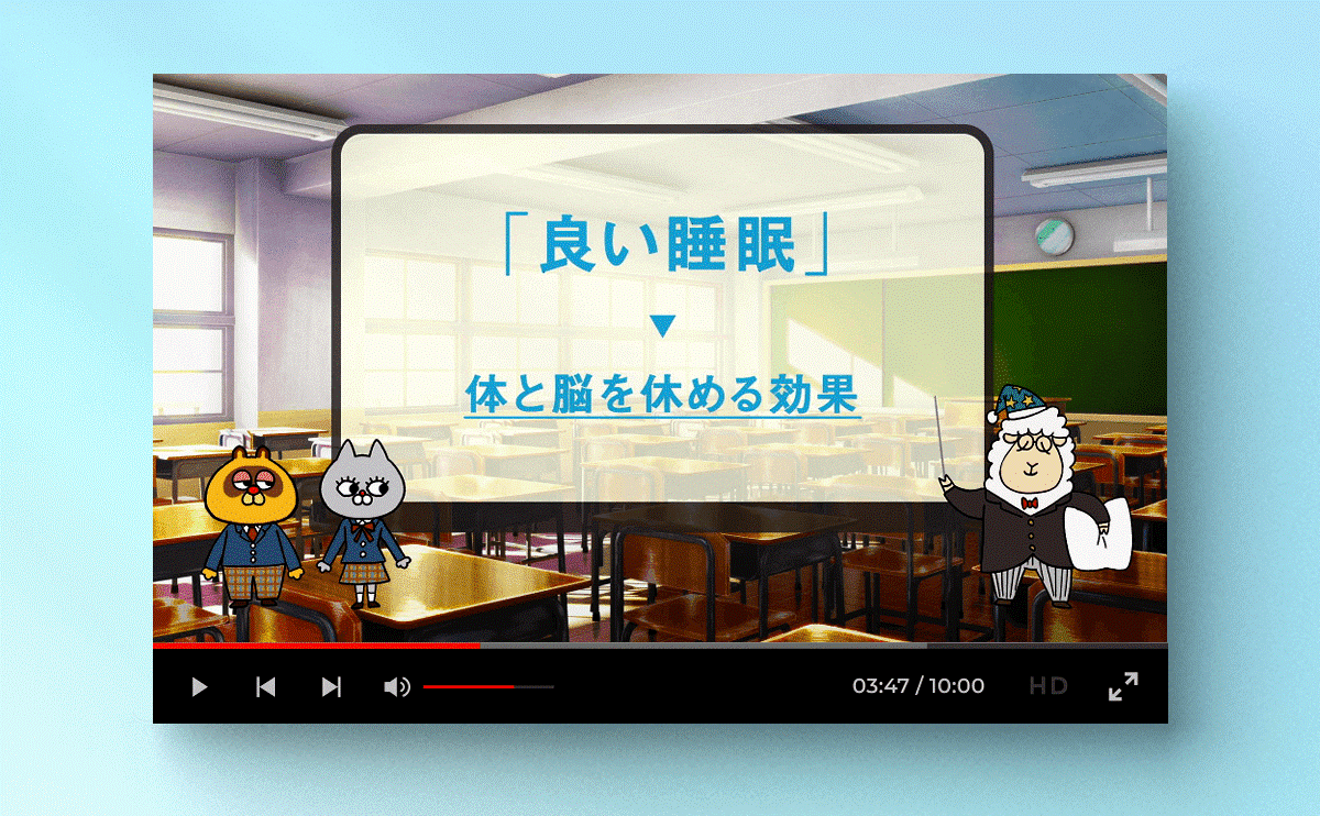 ◇パラマウントベッド睡眠研究所が持つ睡眠と健康に関する知見をもとに、中学生が睡眠を自分ごととしてとらえられるよう、クイズや動画の構成を工夫し、より自分の力が発揮できるように、睡眠の量と満足感について学べるようになっています。