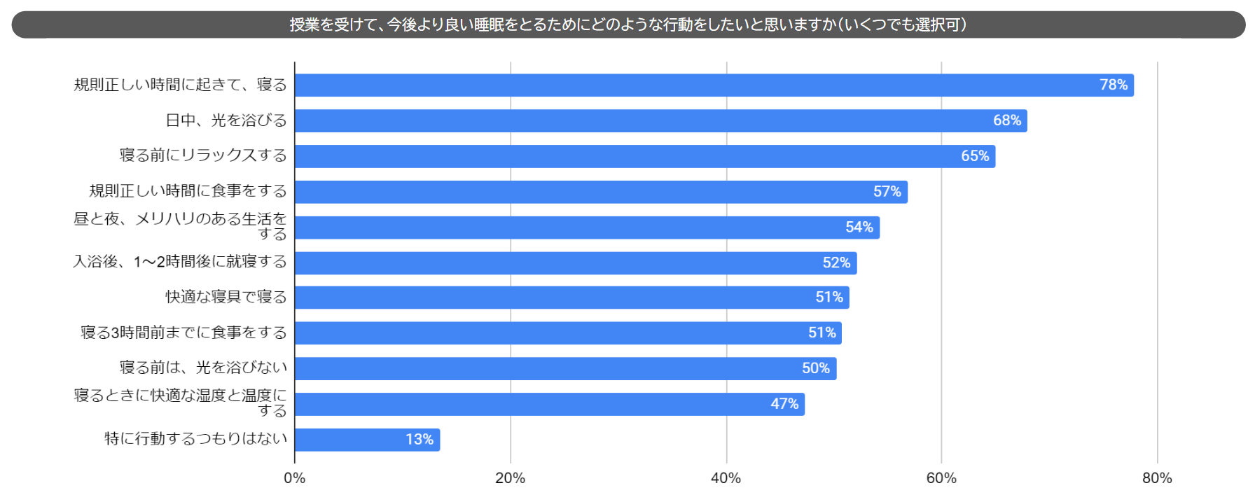 人生における「睡眠」の重要性の理解や、規則正しい生活への行動変容意向が強く表れています。