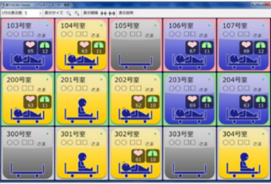 図1:見守り支援システムの入居者一覧表示画面。 図2:赤枠が警告表示(下)。