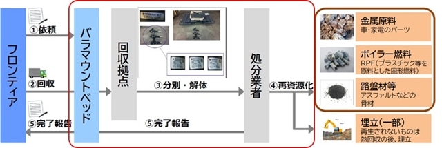 本取り組みは、フロンティア社の福祉用具レンタルを行う千葉メンテナンスセンターで使用済みとなった当社製の介護用ベッドなどを、当社が窓口となり回収・分別・解体を行い金属や燃料などへ99%再資源化するものです。