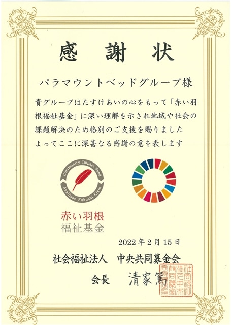 当社は1994年度から「赤い羽根共同募金」、2016年度からは「赤い羽根福祉基金」へ募金活動等を継続しており、 2月15日にパラマウントベッドグループとして感謝状を授与されました。