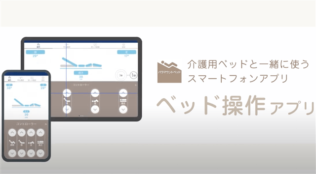 「ベッド操作アプリ」は、スマートフォンなどモバイル端末をはじめ、音声、特殊な入力スイッチによって介護ベッドを操作できるパラマウントベッドオリジナルのアプリです。本動画ではアプリの使い方を説明します。(1分16秒)使用対象の介護ベッドは、「楽匠プラスシリーズ」、「クオラONE」となります。