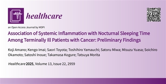 パラマウントベッド睡眠研究所の豊田彩織、木暮貴政が共著者の論文「Association of Systemic Inflammation with Nocturnal Sleeping Time Among Terminally Ill Patients with Cancer: Preliminary Findings」が、学術誌『Healthcare』に掲載されました。本研究はパラマウントベッド睡眠研究所が参加している研究プロジェクト「COSMOS-PAL Study(COntinuous Sleep MOnitoring for dying patients with non-wearable Sensor in PALliative care Study)」の研究成果です。