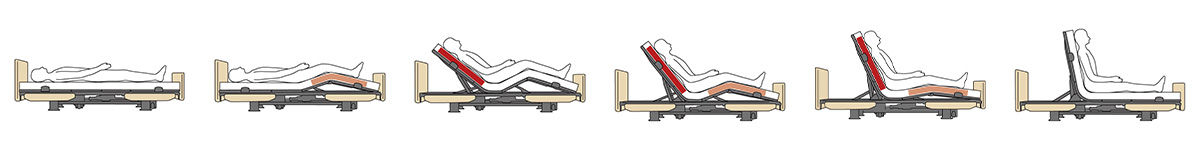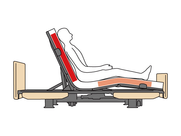 背ボトムと膝ボトムの上げ下げを組み合わせた人間工学に基づく動作制御システムです。背ボトムの角度調節にともなう身体のずれや圧迫感を大幅に軽減し、姿勢のくずれにくい起きあがりを、ボタン操作ひとつで実現します。