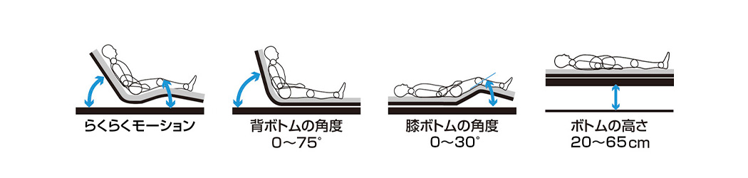 手元スイッチのボタン操作で、らくらくモーションによる起きあがりのほかに、背ボトムの角度(0〜75°)・膝ボトムの角度(0〜30°)・ベッドの高さ(ゆかからボトム上面までの高さ20〜65cm)を個別に操作できます。