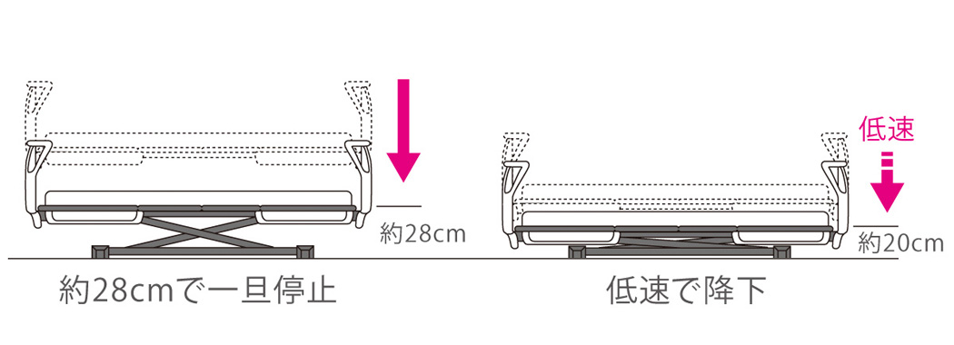 ※28cm以下で停止しているときにベッドをさげると一旦停止せずに最低位(20cm)までさがります。