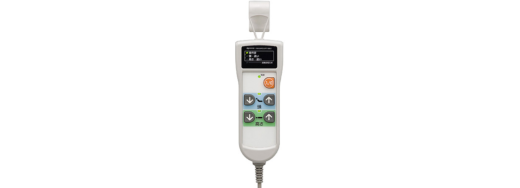 操作したボタンに応じて、その内容を絵記号と数値で表示します。表示内容を見ながら操作することで、利用者様だけでなくスタッフが交代した場合でも、適切な角度や高さを容易に再現できるように配慮しています。また誤操作を予防するために、電源ボタンを搭載しています。