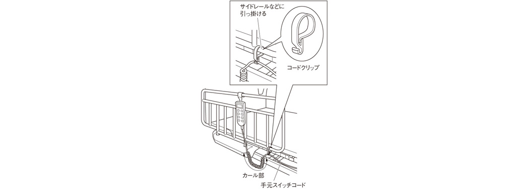 手元スイッチはベッド左右どちらにでも付け替えられます。手元スイッチのコードがゆかに着かないように、ベッドサイドレールなどに取り付けられるコードクリップが付属します。