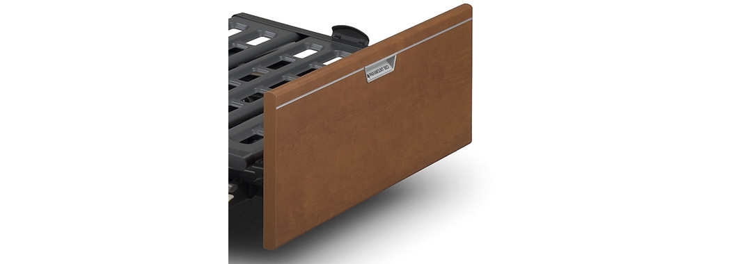 木製ボードはベッドサイドレールや介助バーとの間にできるすき間を少なくした新設計です。取り外しも可能。ベッドの両側に設けたオプション受にもボードと同色の木目シート仕上げを施しています。