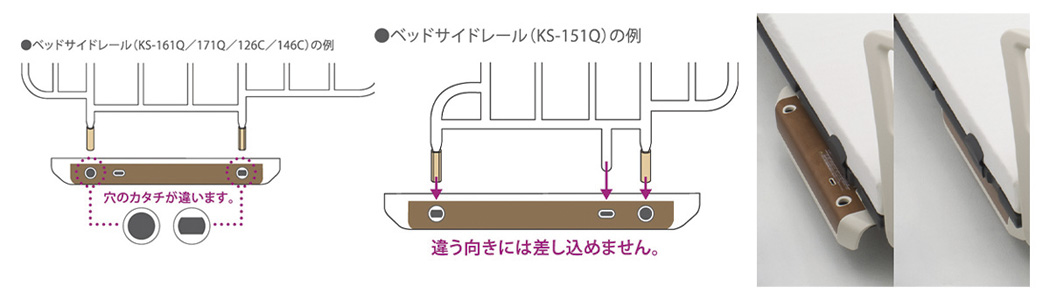 ベッドの両側にオプション受を設けています。ベッドサイドレールなどのオプション製品を誤った向きに取り付けられないように設計されています。また、オプション製品を使用しないときには、離床動作などの妨げにならないように、オプション受をボトムの下に格納できます。