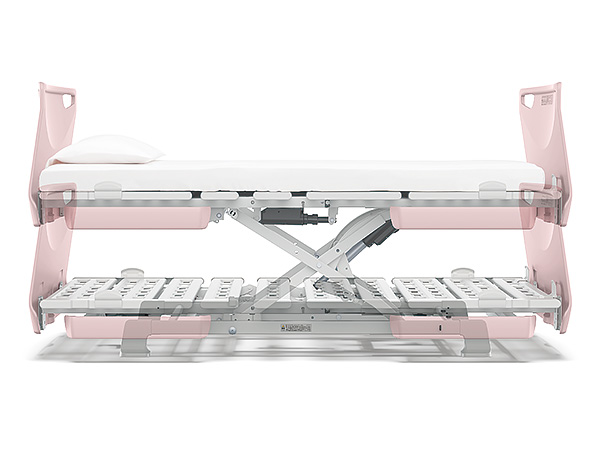 ベッドが最も低い状態で床高は22cm、小柄な方でも端座位を取ったときにかかとがしっかりと接地できる高さです。62cmまで高くできるので、介護する方は腰に負担のかかりにくい姿勢がとれます。高さを調節は垂直昇降方式です。ベッドが前後にスイングしながら昇降する方式と異なり、利用者様がベッドに腰かけた状態であげさげしても姿勢を保ちやすい方式です。