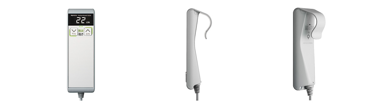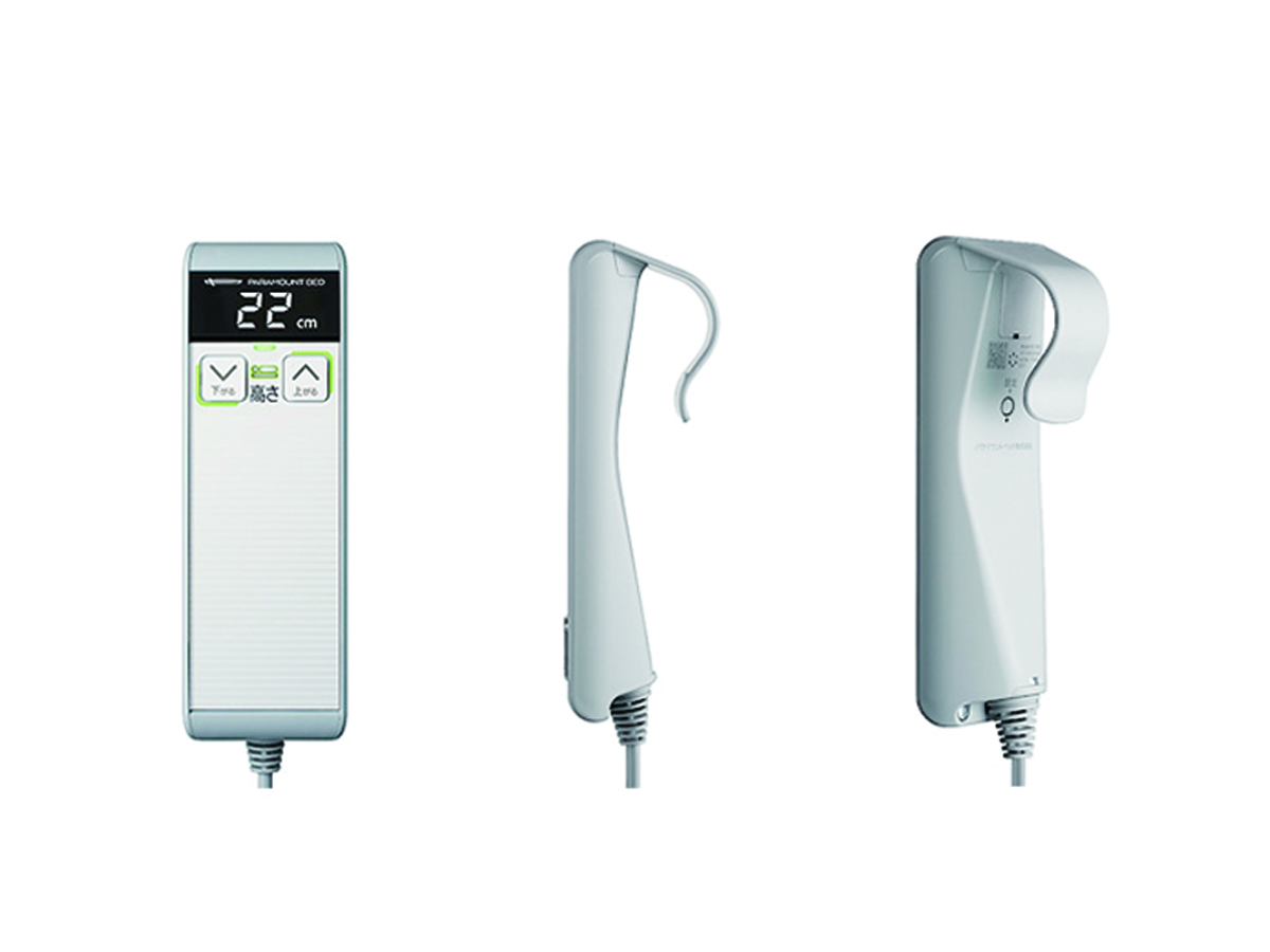 軽量でコンパクト、手に馴染みやすく使いやすい形状です。操作内容ごとに色分けされたデザインを採用し、「上がる」「下がる」ボタンを指先でも識別できるように突起を設けています。さらに表示パネルには大きくはっきりとした文字でベッドの角度や高さを表示するなど、わかりやすく正確に操作できるように配慮しています。手元スイッチはベッドの左右どちらでも利用できます。また、手元スイッチのコードがゆかに着かないように、ベッドサイドレールなどに取り付けられるコードグリップが付属します。