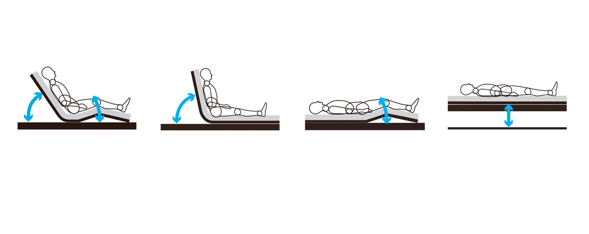 3モーターシリーズには、より安定した姿勢で起きあがれる「らくらくモーション」を採用しています。手元スイッチのボタン操作で、背ボトムの角度、膝ボトムの角度、ベッドの高さを個別に操作できます。上体を起こして過ごすときの姿勢の調節、起きあがるときや立ちあがるときの動作支援など、用途に合わせたポジションに調節することで、利用者様をサポートして、介護する方の負担を軽減します。