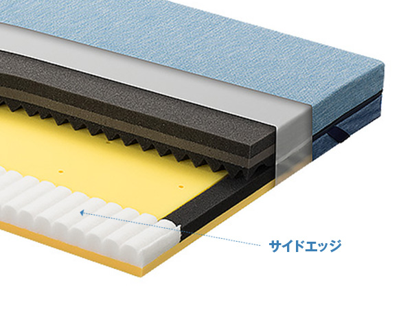 端座位をとるときや移乗するときに、身体の沈み込みを抑えて姿勢が安定しやすくなるように、マットレスの両サイドには幅10cmのかための素材を配しています。