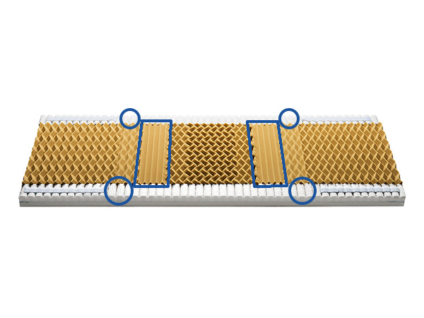 クッション材の3層目、ベッドの動きに合わせて曲がる部分には、プロファイル加工を直線上のスリットとしています。またサイドエッジにもスリット(カッティング)加工を施しています。これらの加工によりマットレスの屈曲性を高めてベッドへの追従性を向上されることで、背あげに伴う圧迫感と姿勢のくずれを抑えます。