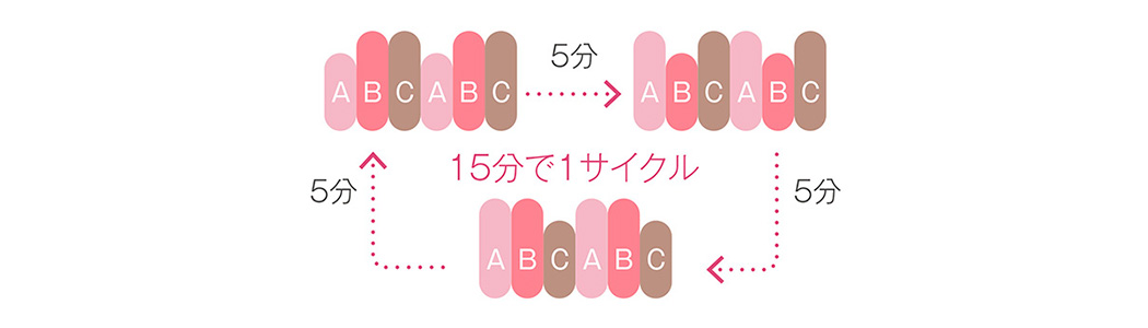 エアセルの内圧を3つおきに順番で低くしたり高くしたりすることを繰り返す3連切替により、身体の同じ部位に圧力が加わり続けないようにします。