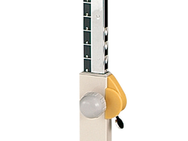 天板の高さは63~95.5cmまで調節できます。高さを調節し、ノブボルトを締めこむと支柱に設けた位置合わせのガイドに従って天板が固定されます。天板の高さを調節するときは、ノブボルトをゆるめてから高さ調節レバーを押します。ノブボルトをゆるめただけでは天板が落下しないように操作の安全性に配慮した急落防止設計です。