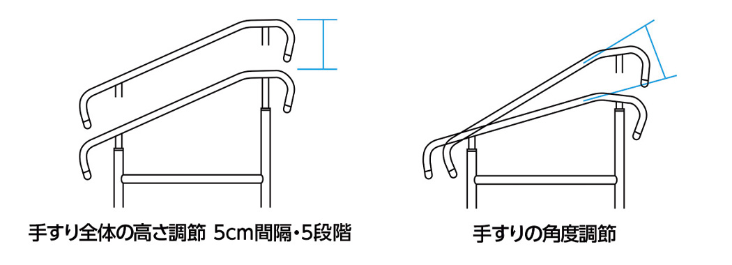 手すり2本の両手すりタイプ。手すりの間口は51.5cmです。また、手すりの高さは5段階(5cm間隔)の調節が可能です。さらに上端側の高さを調節することで手すりの角度を調節することもできます。