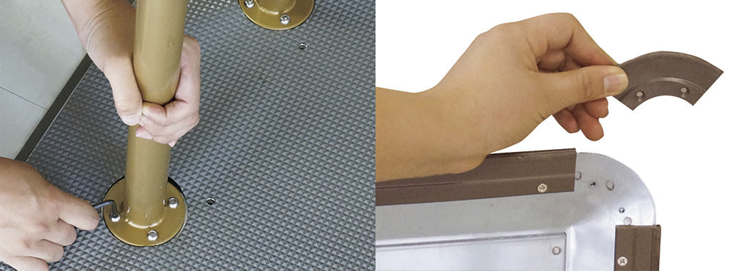 ベースプレートを裏返さずに、お使いになる状態で手すりフレームの着脱が可能な、組み立てや点検がしやすい構造です。また、ベースプレートのエッジカバーの取り付けも接着剤を仕様しない着脱が可能な方式なので、破損した場合は、エッジカバーだけの交換が可能です。