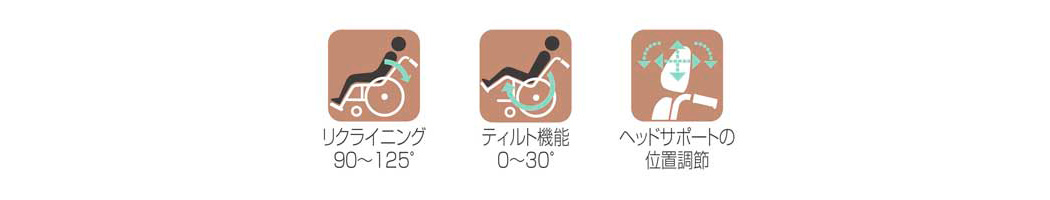 バックサポートと座面の角度を一定に維持しながら、後方に傾けることができます。座位を保ちにくい方にも対応しやすい機能です。また、圧力のかかる部位を変えられるので、床ずれ予防に有効です。