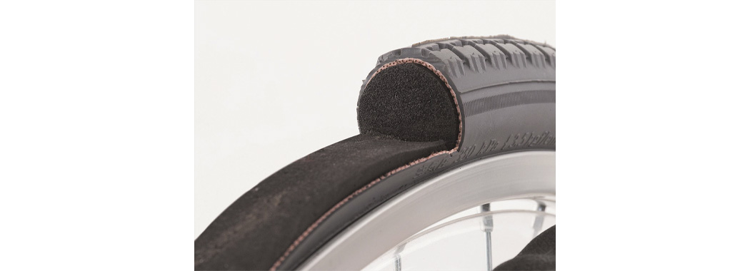 空気管理が不要でエアータイヤに近いクッション性を実現したハイブリッドタイプのノーパンクタイヤです。タイヤの磨耗による交換を除けば約5年は使用可能な耐久性の高いインナーチューブを採用しています。
