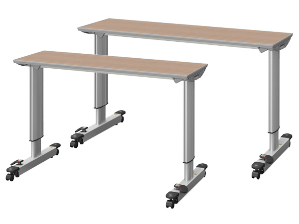 両脚タイプのため安定しやすく、天板が広いためさまざまな用途に対応します。移動ロック付きキャスターと移動ロックなしキャスターの2種類をご用意しています。